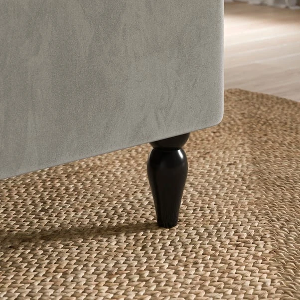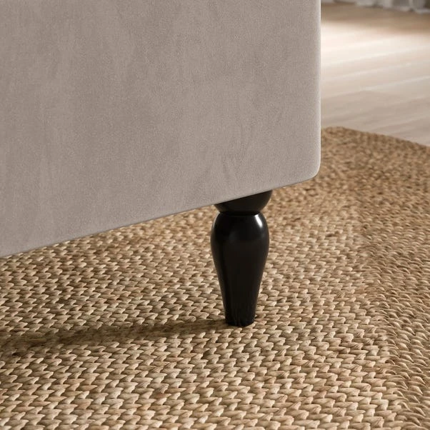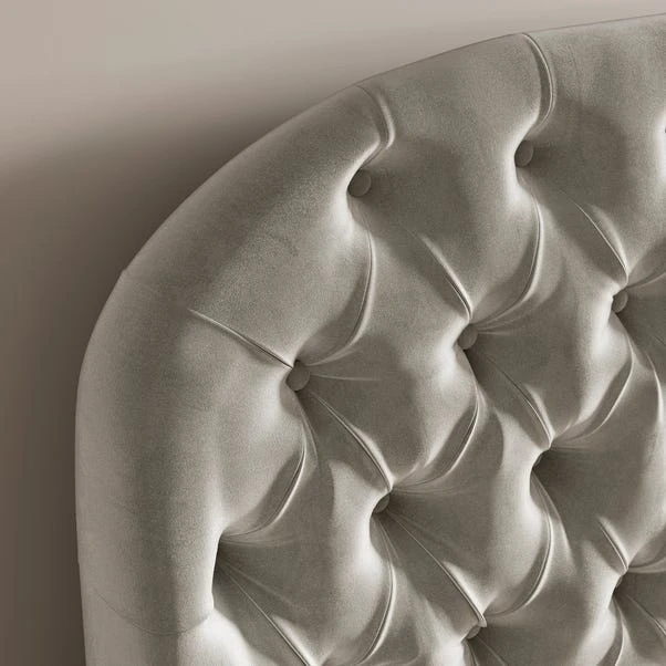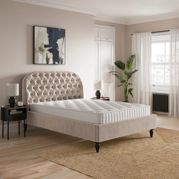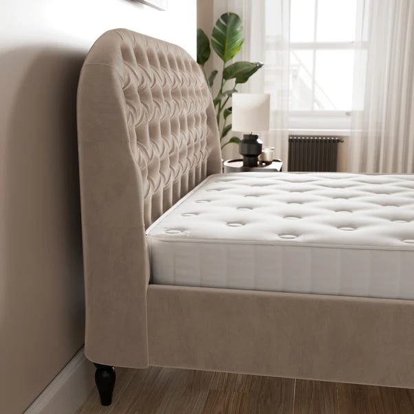 This bed frame brings a touch of opulence and glamour to your bedroom with its luxurious hand-sewn fabric finish and elegant wooden legs. The bed features a stunning curved Chesterfield-style headboard, adding timeless sophistication to any décor. Equipped with a spring slatted base, it offers enhanced support and comfort for a restful night’s sleep.