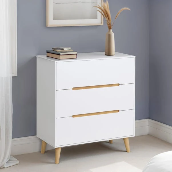 Offering a modern, clean design the Alicia chest of drawers features a white painted finish and would be stylish addition to any bedroom. This self-assembly chest of drawers features three spacious drawers and is crafted with tapered, oak finished legs and matching oak finished recessed drawer handles.