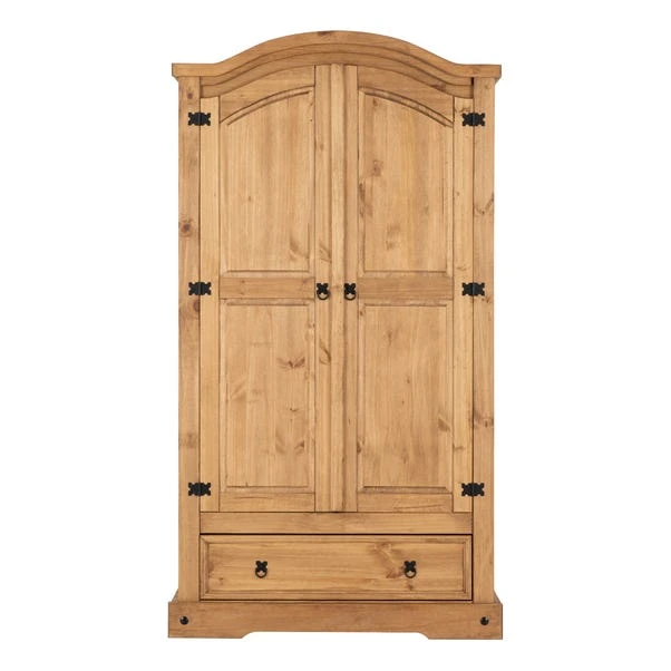 The Corona range of solid pine furniture offers excellent value for money. The Mexican influence in the design and style creates a range that would be at home in a variety of settings. All items in this range are stained to reproduce the classic look of Mexican pine furniture with the wood being protected by a light wax. Metal fittings are used which further complement the looks of this stylish rustic furniture. Curved top style with 2 doors featuring a hanging rail with a shelf above in the centre and 1 drawer for extra storage.