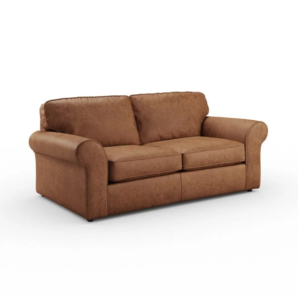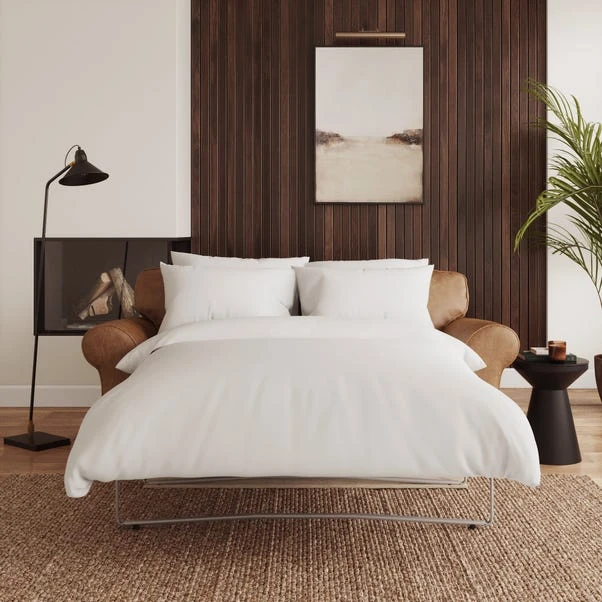 This sofa bed features gracefully curved arms and sturdy wooden legs, combining timeless elegance with functional versatility. Upholstered in durable faux leather, it offers a sophisticated seating experience during the day and transforms into a comfortable bed for overnight guests. Enhanced with brand-new foam cushions, it ensures lasting comfort and support whether lounging or sleeping.