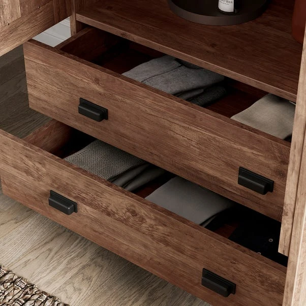 The Fulton 4 Door Wardrobe is a practical and stylish addition to any bedroom, with a rustic pine finish and black metal hardware creating an industrial look. Offering plenty of useful storage space, this Fulton wardrobe comes complete with a hanging rail, 3 spacious shelves, and 2 drawers for all your storage needs. The mirrored doors also help make getting ready a breeze.