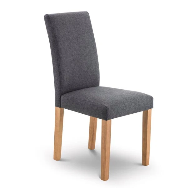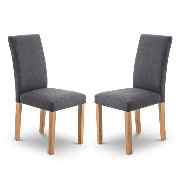 Constructed from a hardwood frame in an oak finish, these chairs are upholstered in elegant slate linen fabric with foam padding. The sprung and webbed seat base provides durability and comfort, making these chairs suitable for a wide range of décor styles.