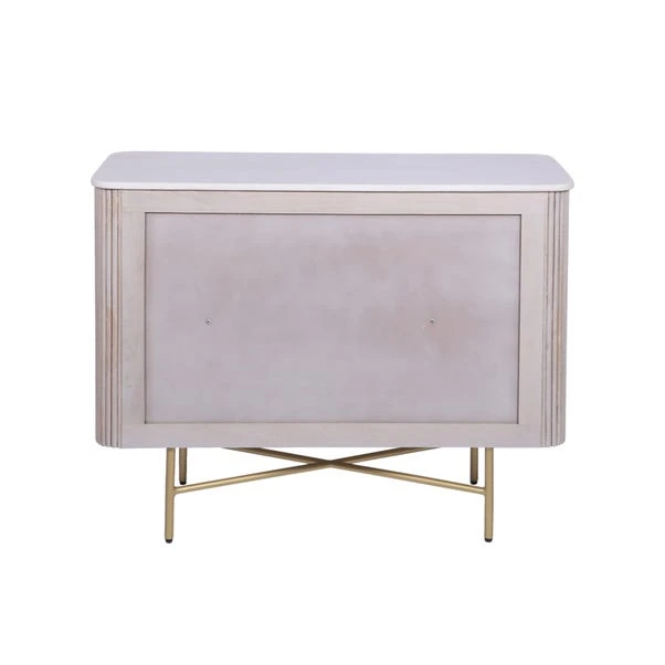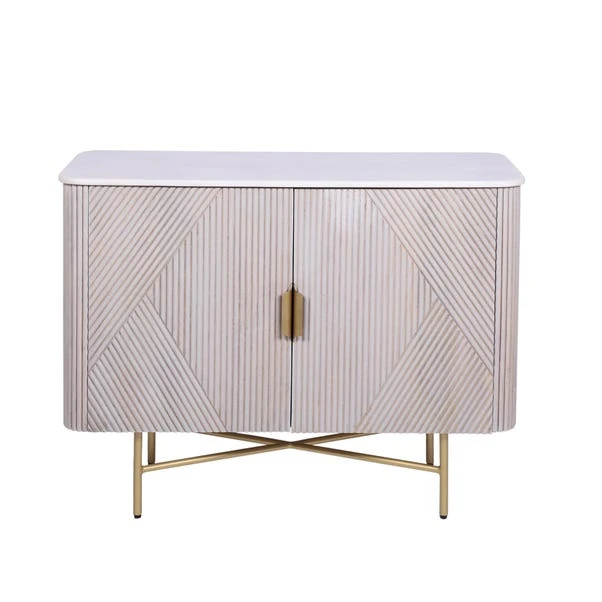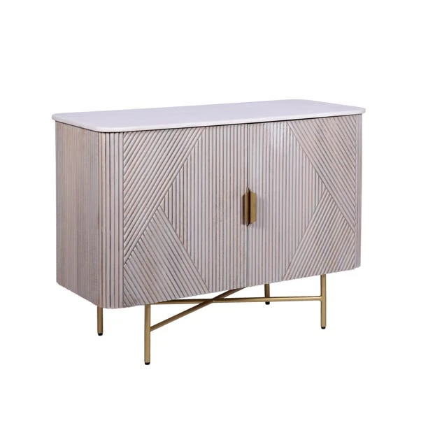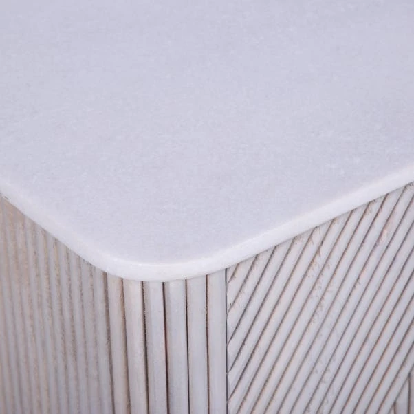A statement of timeless elegance, the Cleo 2-Door Sideboard brings natural beauty and refined craftsmanship to any home. Constructed from solid mango wood, this piece showcases a beautifully textured vertical ribbed design that adds depth and sophistication. The luxurious marble top provides a striking contrast to the rich wood tones, creating a sleek yet organic look. Behind its two doors, generous storage space ensures easy organisation for dining essentials, books, or household items.