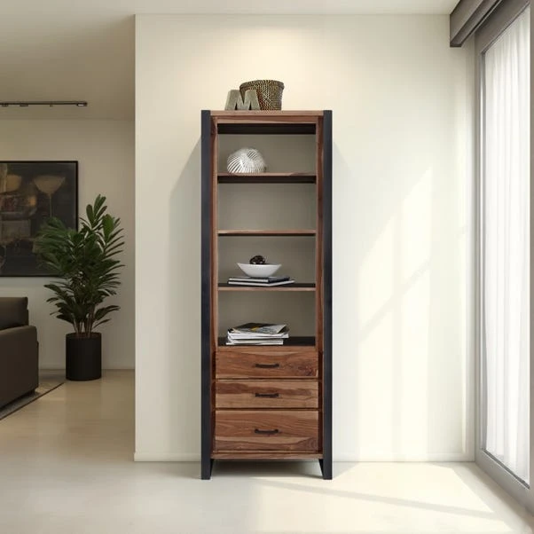 A perfect blend of practicality and style, the logan bookcase is designed to bring effortless organisation to your home. Crafted from solid Sheesham wood with a natural finish, it highlights the wood’s rich grain and warm tones, adding a touch of rustic charm. Its open shelving provides ample space for displaying books, ornaments, or treasured keepsakes, while three spacious drawers offer concealed storage for a clutter-free look. The sleek black metal legs lend a contemporary contrast, ensuring this piece complements both modern and traditional interiors.