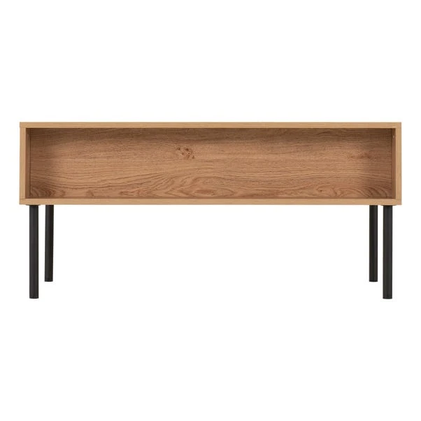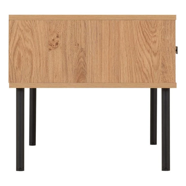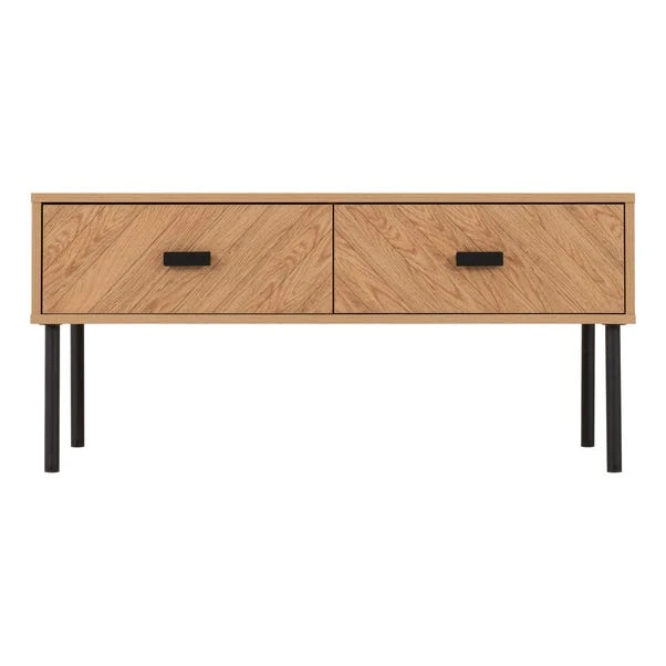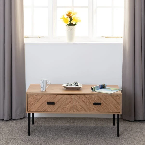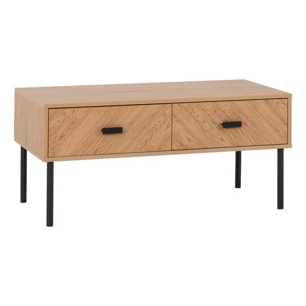 With its medium oak effect boasting an exquisite wood grain appearance and sleek black metal hardware, this table exudes sophistication. Featuring two spacious drawers, it provides ample storage to keep your living area tidy by neatly organising essentials like remote controls, magazines, and more. This versatile table isn’t just about storage, it serves as a practical surface for beverages, books, or decor, perfect for entertaining guests or cosy evenings in.