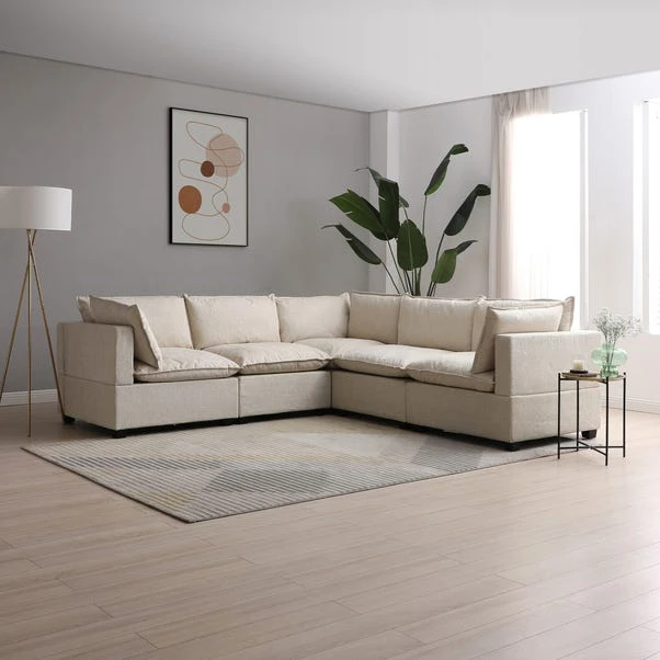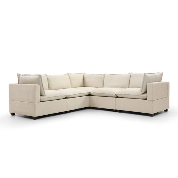 Get ready to take your lounging game to the next level with the Moda Full Corner Sofa. With three modular corner seats and two modular armless chairs included, you can create a variety of configurations to suit your space and needs. Plus, the upholstered finish and sturdy wooden legs make it both stylish and practical.