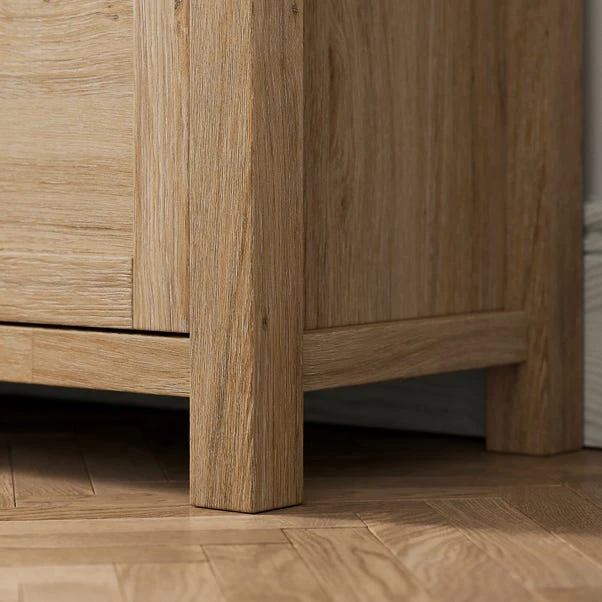 Made with oak wood grain paper foil, this unit showcases visible shelves and internal shelving for organised storage. Its stable construction and TV stand design provide ample space for your devices and accessories. Complete with brushed metal brass handles and high-quality fittings and hinges, this unit offers both durability and style. Cable holes facilitate a tidy setup, making this unit a functional and attractive addition to your living space.