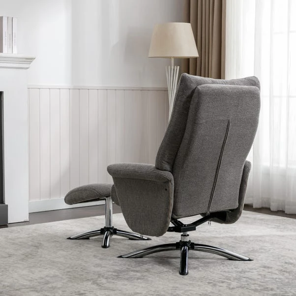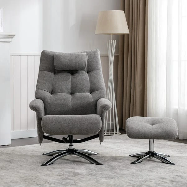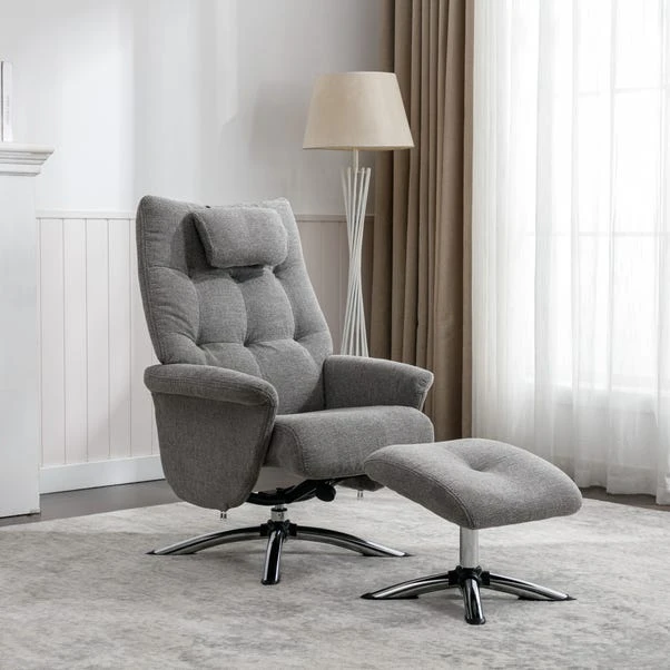 The Orson Chenille Reclining Swivel Chair with Footstool invites you to fully relax in its wonderful, easygoing design. Choose the Orson for multiple recliner positions, a 360-degree swivel, headrest feature, matching footstool, and premium Chenille fabric.