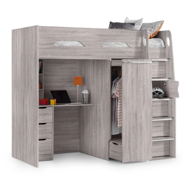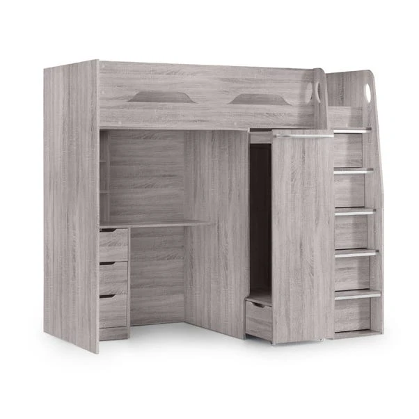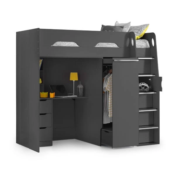 With an integrated wardrobe and desk, the Pegasus High Sleeper is the ultimate in functional bedroom furniture for kids and teenagers. The pull-out wardrobe contains a handy storage drawer which maximizes the space available within its compact build, whilst the desk includes further storage drawers and cable holes. The robust ladder contains hidden storage cupboards at every step.