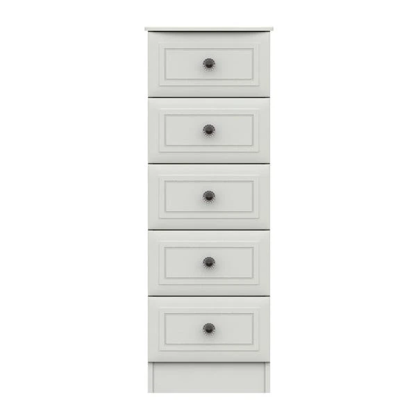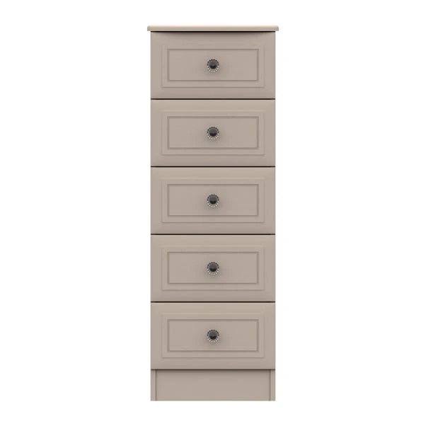 The Portia 5 Tall Chest of Drawers offers a stunning timeless design, perfect for enhancing any bedroom space. This stylish chest of drawers offers a traditional styling, with its elegant bevelled edge profile drawer fronts with beautiful crystal look handles. Supplied fully assembled for convenience, the Portia comes with five spacious drawers, complete with 8mm heavy duty bases, linen look insides and easy glide metal runners.