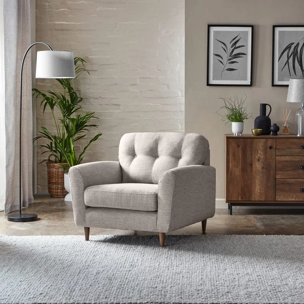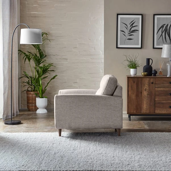 A compact snuggle chair with a modern buttoned back and forgiving tonal weave upholstery, this chair is made from 100% recycled polyester to ensure a low carbon footprint. Comfortable foam and fibre-wrap seat cushions allow you to relax for hours on end.